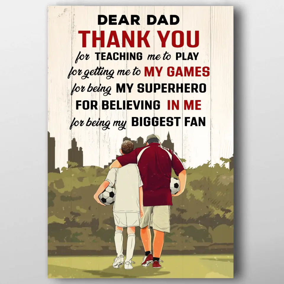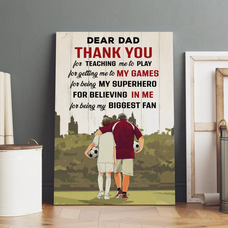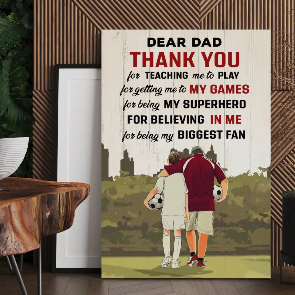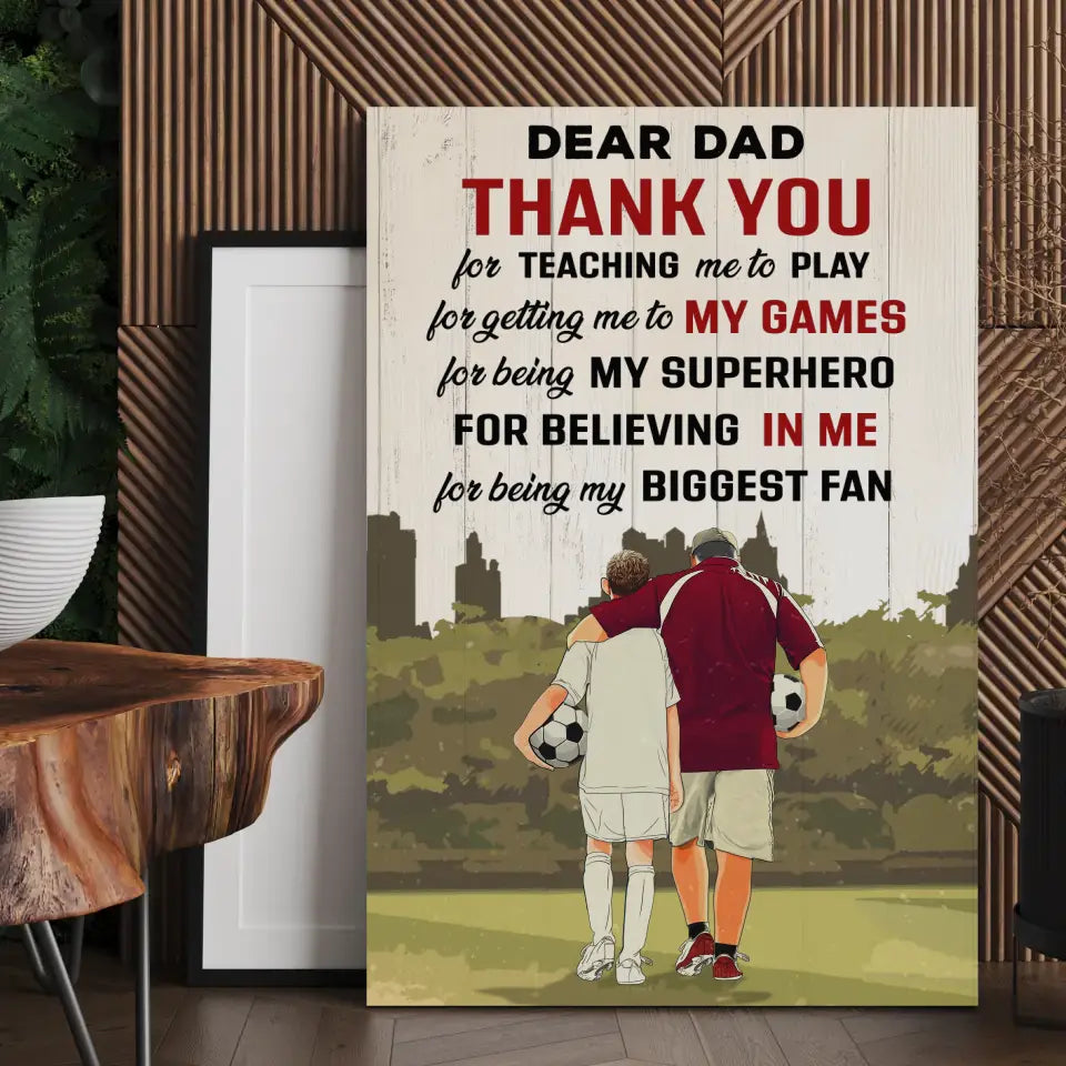 Custom Personalized Dear Dad, Thank You For Teaching Me To Play Soccer Poster, Canvas with custom Name, Number & Appearance, Soccer Gift, Gifts For Soccer Players, Sport Gifts For Son, Soccer Lover Gifts NHT0524C01SA