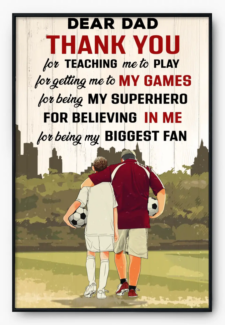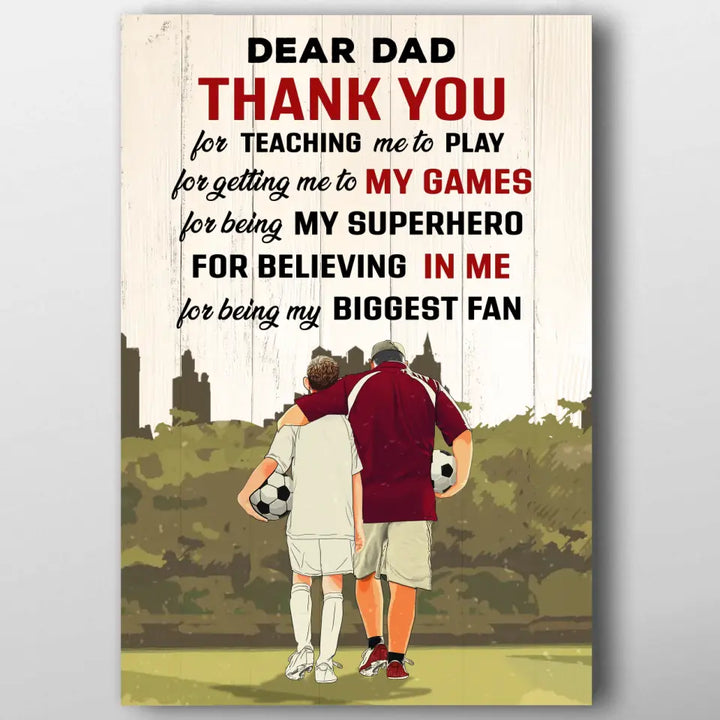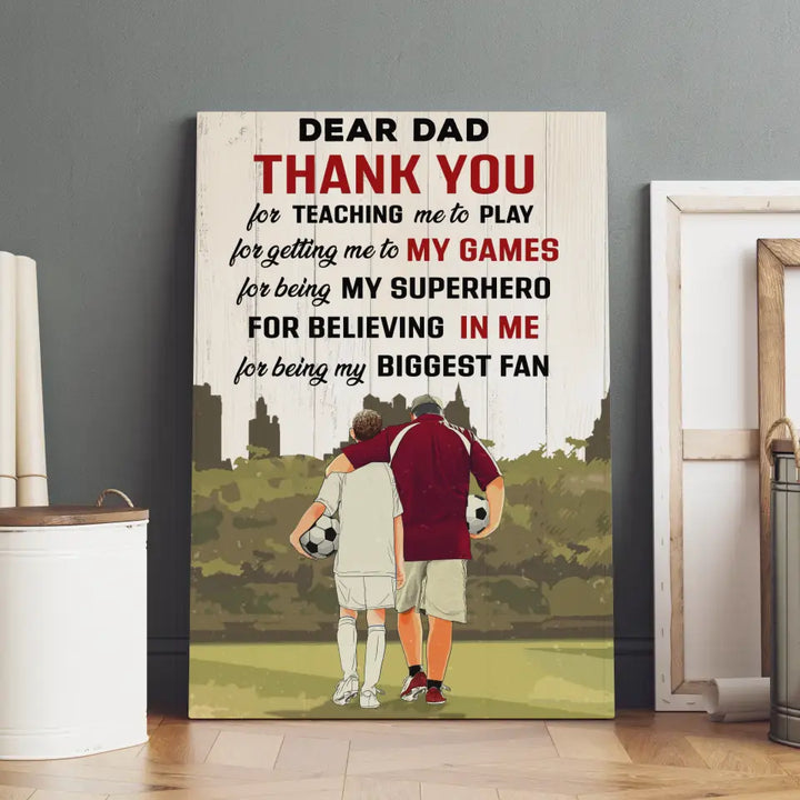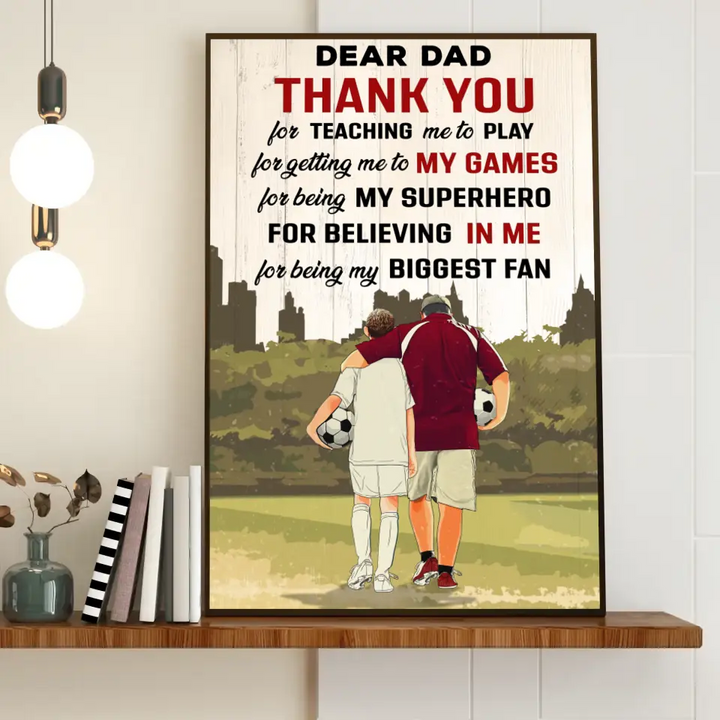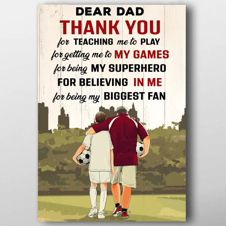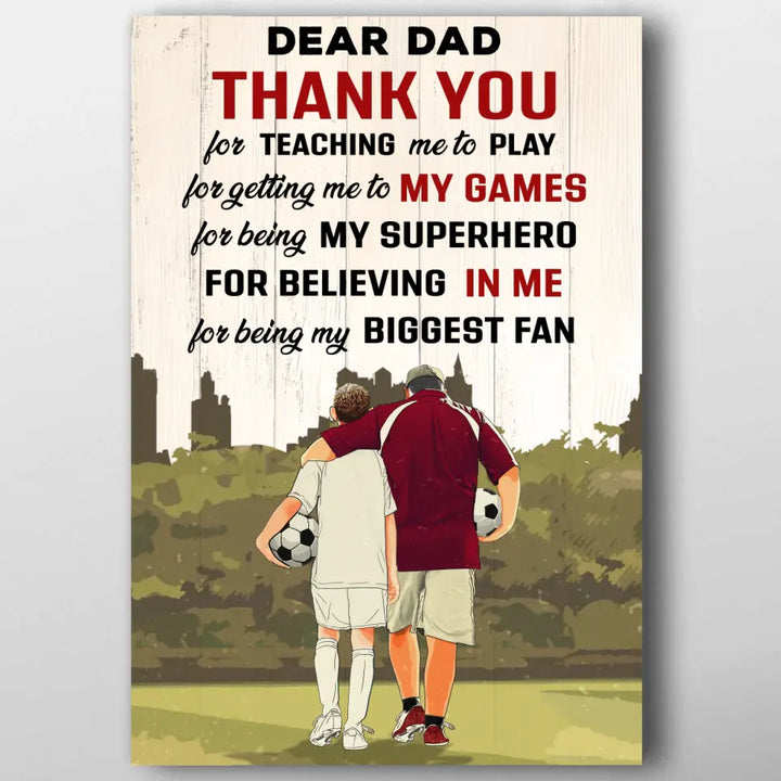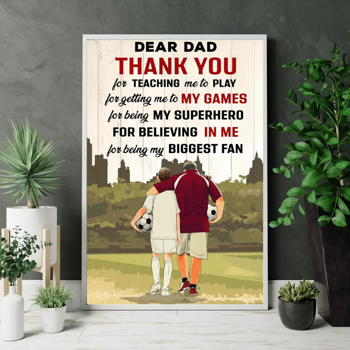 Custom Personalized Dear Dad, Thank You For Teaching Me To Play Soccer Poster, Canvas with custom Name, Number & Appearance, Soccer Gift, Gifts For Soccer Players, Sport Gifts For Son, Soccer Lover Gifts NHT0524C01SA