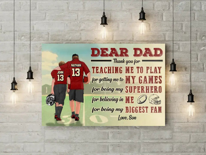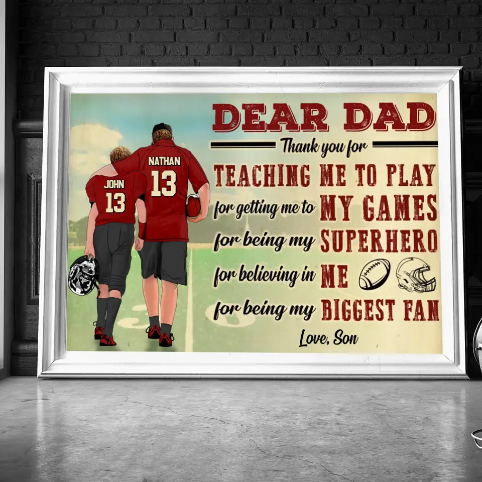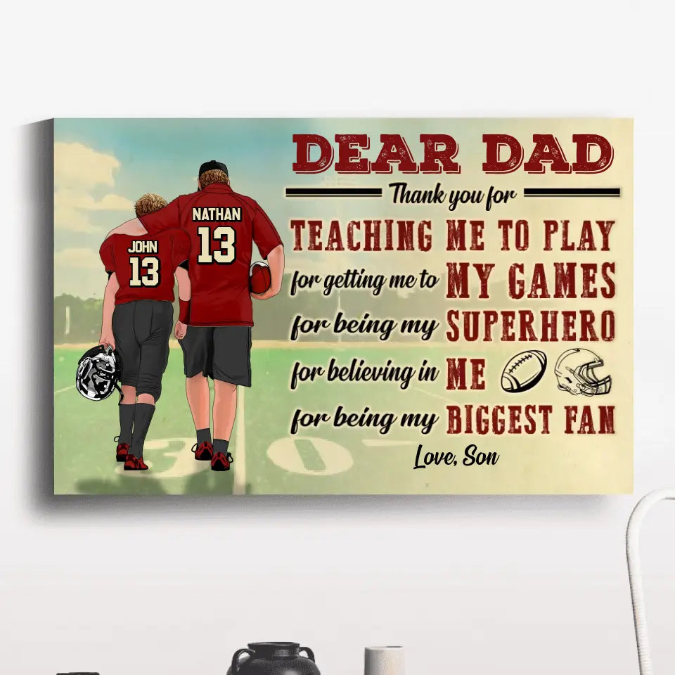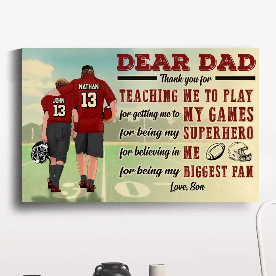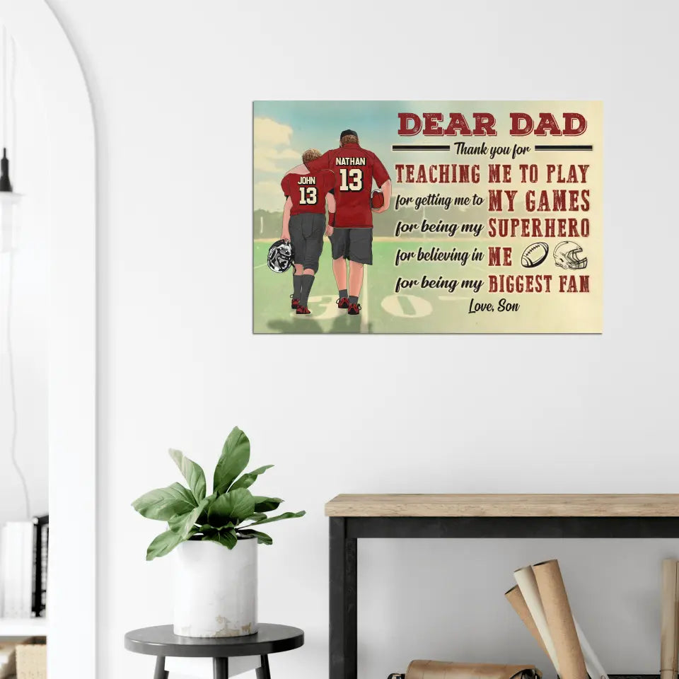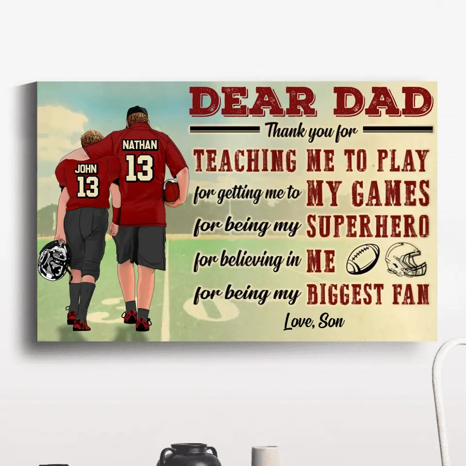 Custom Personalized Dear Dad, Thank You For Teaching Me To Play Football Poster, Canvas with custom Name, Number & Appearance, American Football Gift, Gifts For American Football Players, Football Lover Gifts LLL0628C02SA