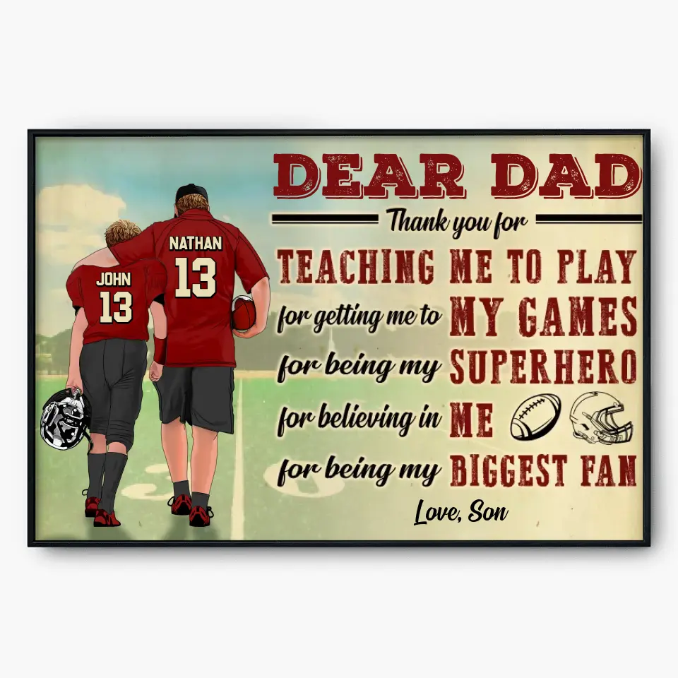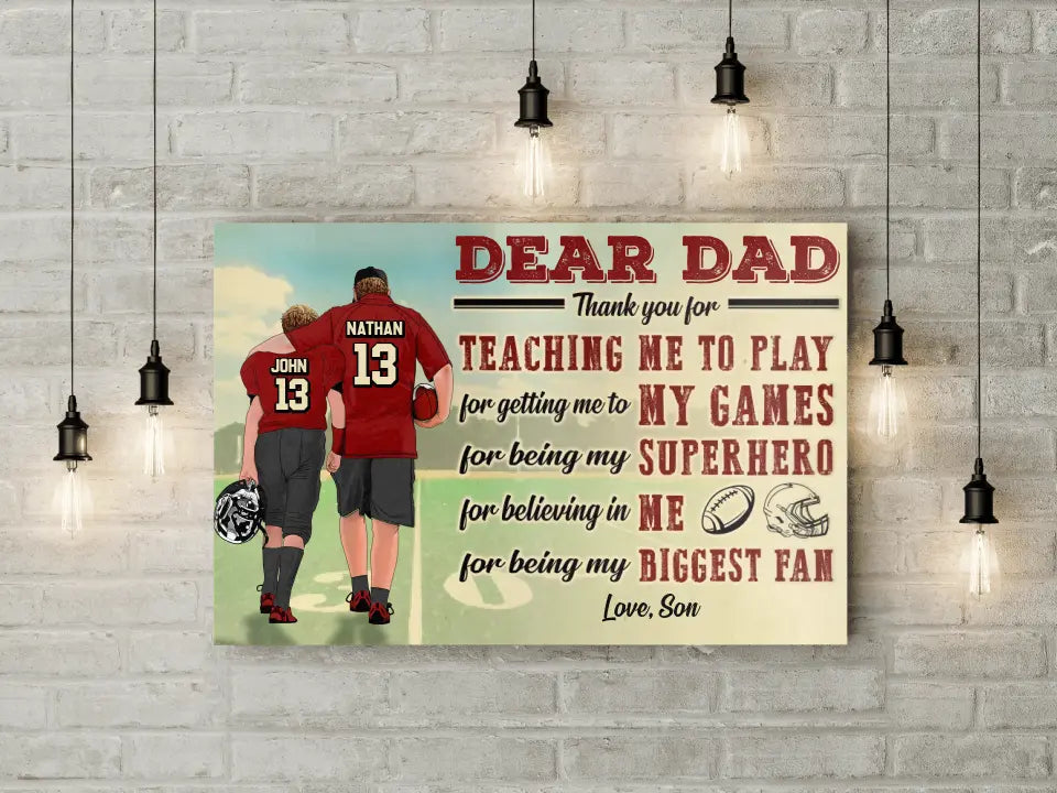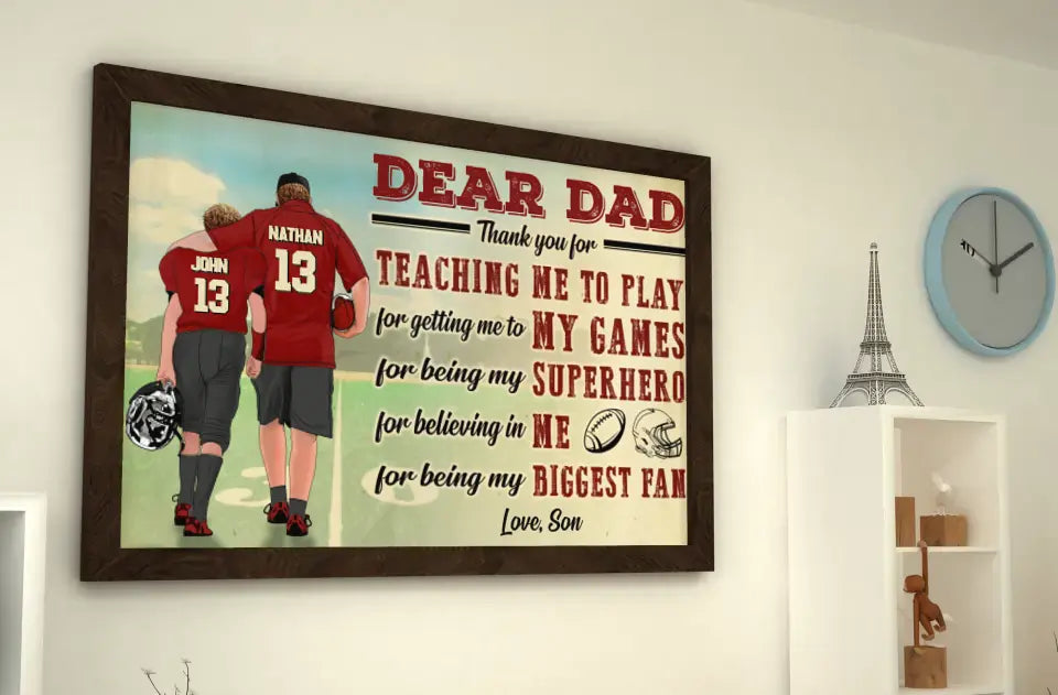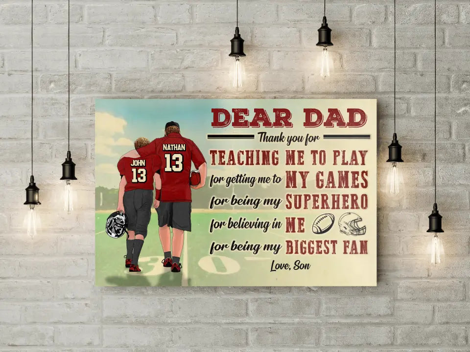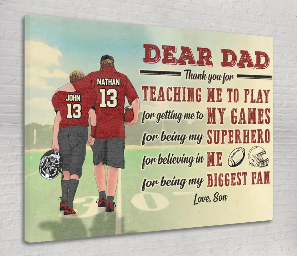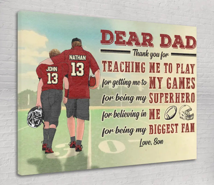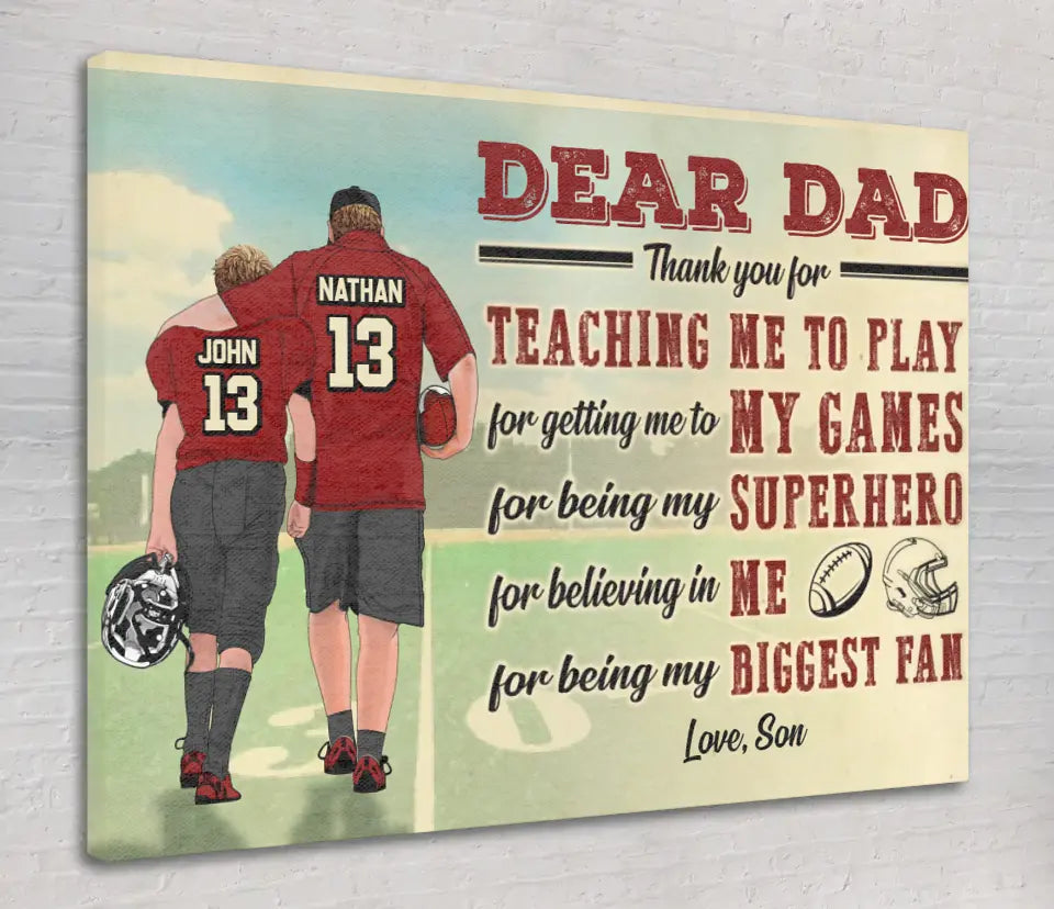 Custom Personalized Dear Dad, Thank You For Teaching Me To Play Football Poster, Canvas with custom Name, Number & Appearance, American Football Gift, Gifts For American Football Players, Football Lover Gifts LLL0628C02SA