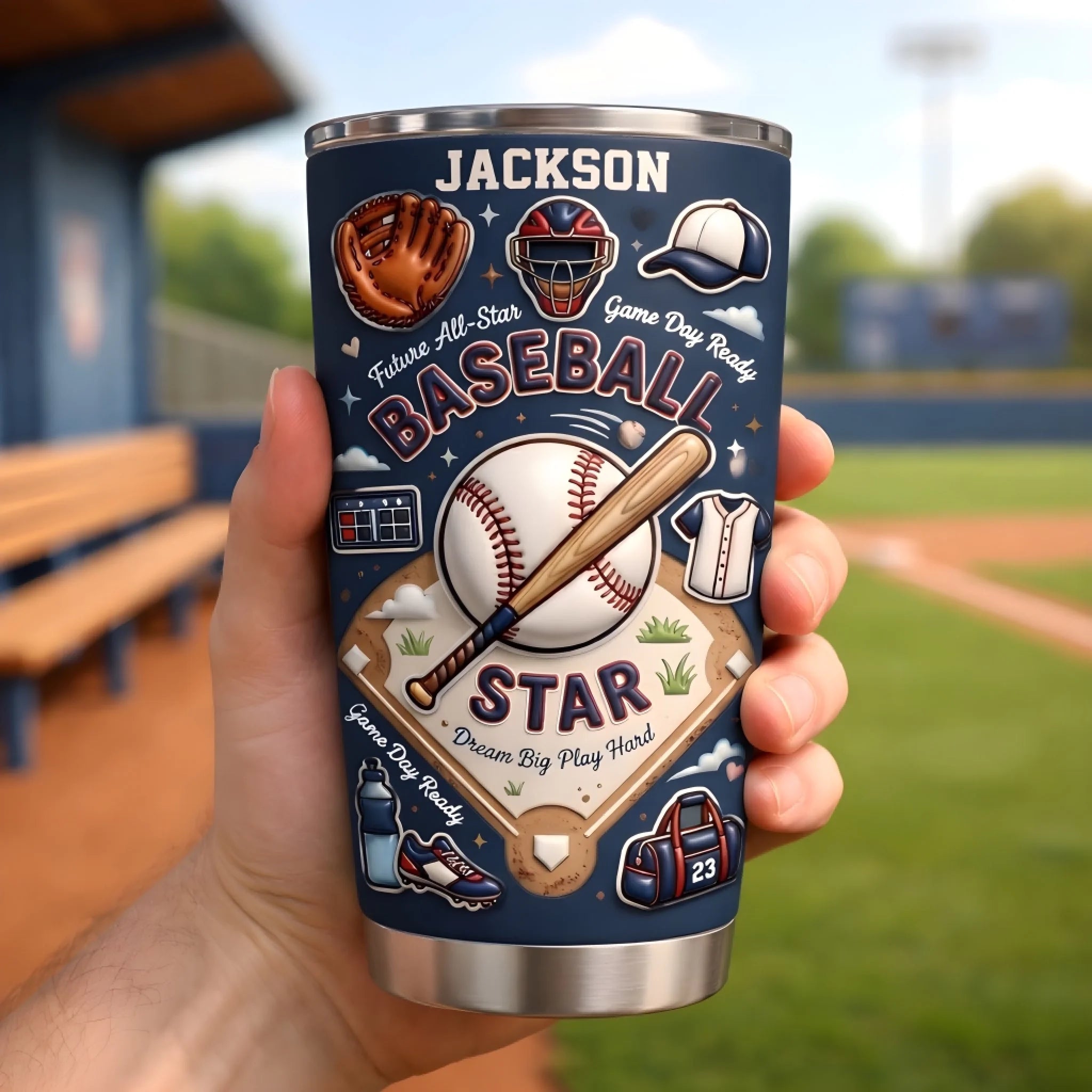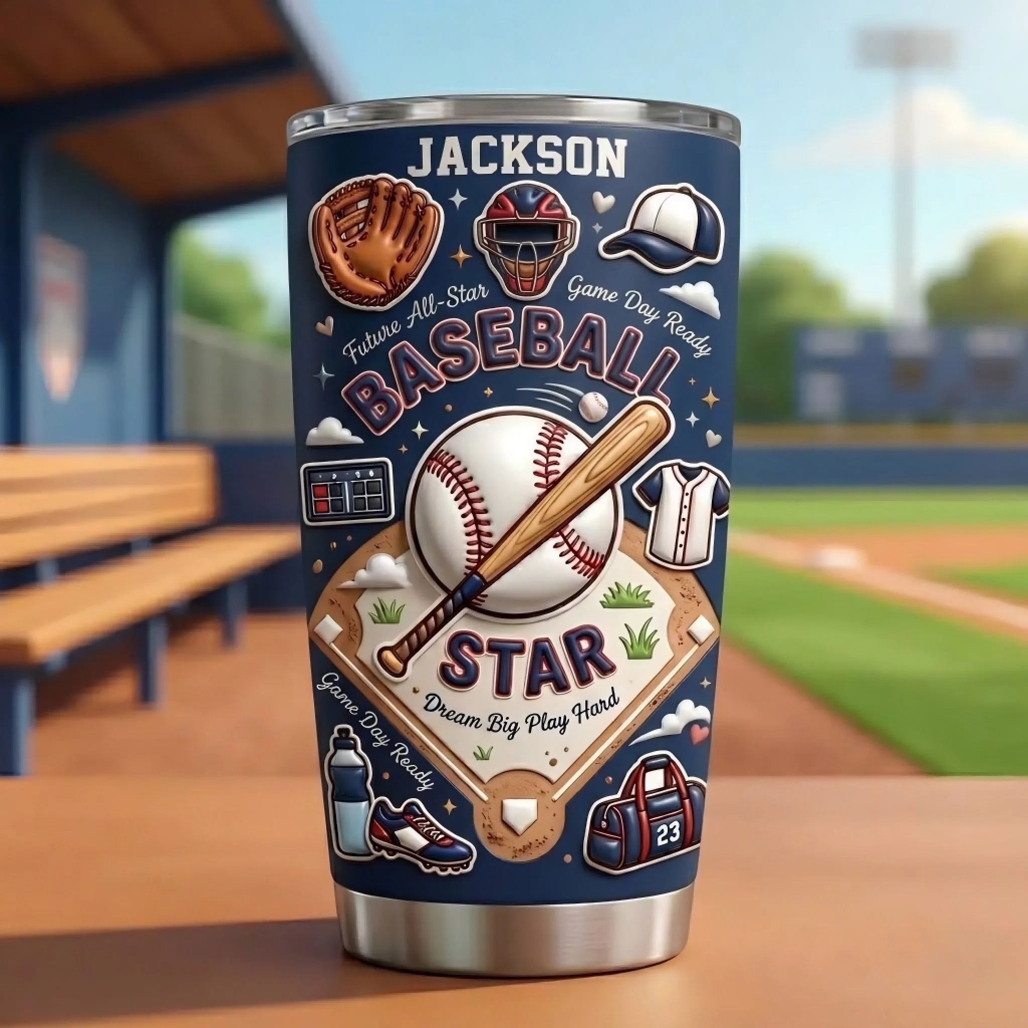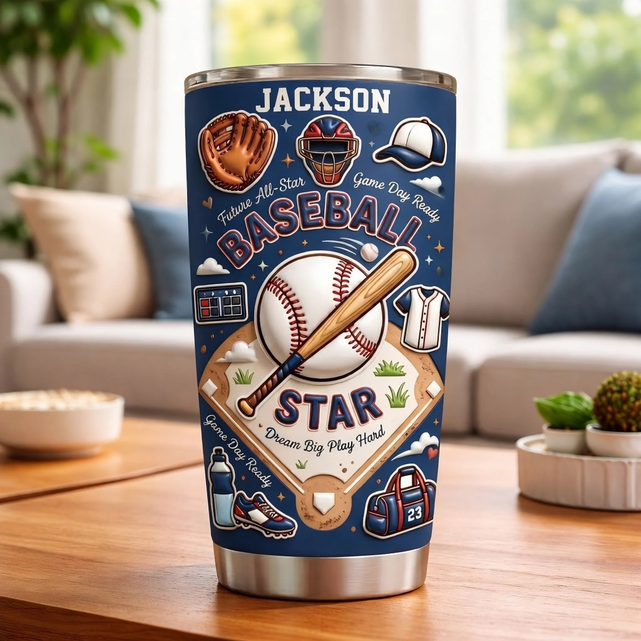 3D Inflated Effect Tumbler, Personalized Baseball Star Cup, Custom Name Baseball Tumbler, Kids Baseball Gift, Baseball Player Drinkware NTH26040244